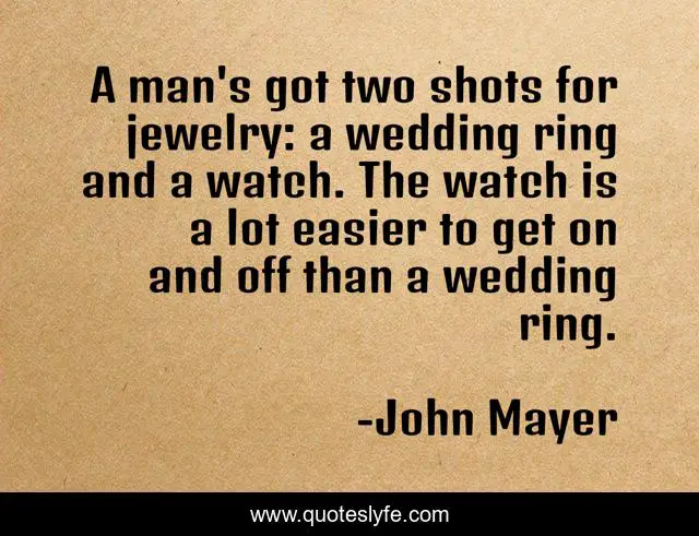 This page presents the quote "A man's got two shots for jewelry: a wedding ring and a watch. The watch is a lot easier to get on and off than a wedding ring.". Author of this quote is John Mayer. This quote is about ring, jewelry, man,.