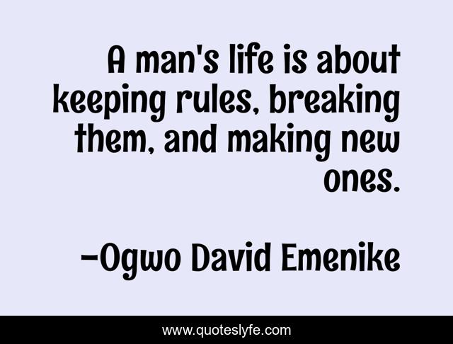 This page presents the quote "A man's life is about keeping rules, breaking them, and making new ones.". Author of this quote is Ogwo David Emenike. This quote is about rules, men, experience, breaking-rules, courage, manhood, keeping-rules, man,.