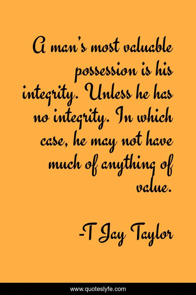 This page presents the quote "A man’s most valuable possession is his integrity. Unless he has no integrity. In which case, he may not have much of anything of value.". Author of this quote is T Jay Taylor. This quote is about honesty, morals, character, principles, legacy, virtue, respect, ethics, trust,.