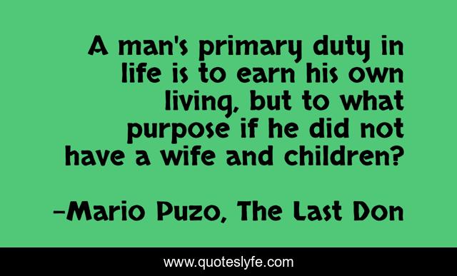 This page presents the quote "A man's primary duty in life is to earn his own living, but to what purpose if he did not have a wife and children?". Author of this quote is Mario Puzo, The Last Don. This quote is about quote, duty-of-man, the-last-don, mario-puzo,.