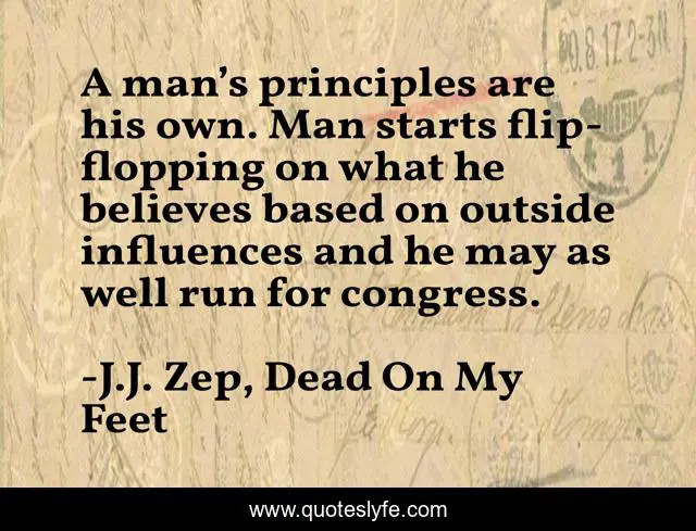 This page presents the quote "A man’s principles are his own. Man starts flip-flopping on what he believes based on outside influences and he may as well run for congress.". Author of this quote is J.J. Zep, Dead On My Feet. This quote is about horror, zombies,.