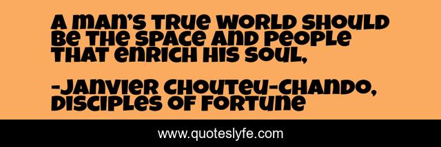 This page presents the quote "A man’s true world should be the space and people that enrich his soul, ". Author of this quote is Janvier Chouteu-Chando, Disciples of Fortune. This quote is about life, love, wisdom, happiness, patriotism, affection,.