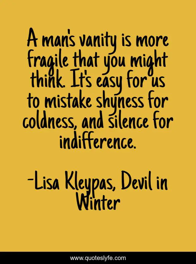 This page presents the quote "A man's vanity is more fragile that you might think. It's easy for us to mistake shyness for coldness, and silence for indifference.". Author of this quote is Lisa Kleypas, Devil in Winter. This quote is about shyness, coldness, indifference, vanity,.
