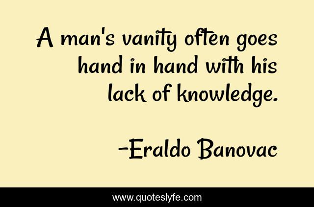 This page presents the quote "A man's vanity often goes hand in hand with his lack of knowledge.". Author of this quote is Eraldo Banovac. This quote is about lack-of-knowledge, vanity, philosophy, sociology, knowledge,.