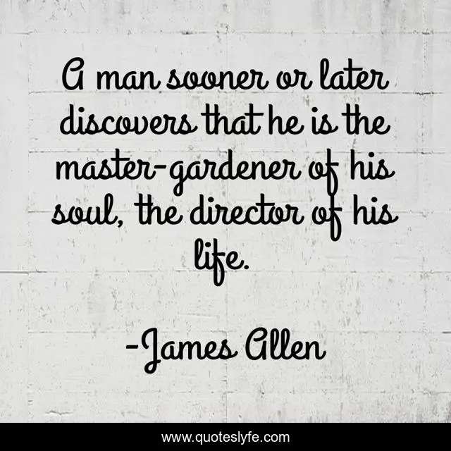 This page presents the quote "A man sooner or later discovers that he is the master-gardener of his soul, the director of his life.". Author of this quote is James Allen. This quote is about director, soul, man,.