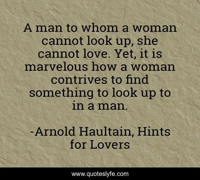 This page presents the quote "A man to whom a woman cannot look up, she cannot love. Yet, it is marvelous how a woman contrives to find something to look up to in a man.". Author of this quote is Arnold Haultain, Hints for Lovers. This quote is about relationships, woman, love, affection, man,.