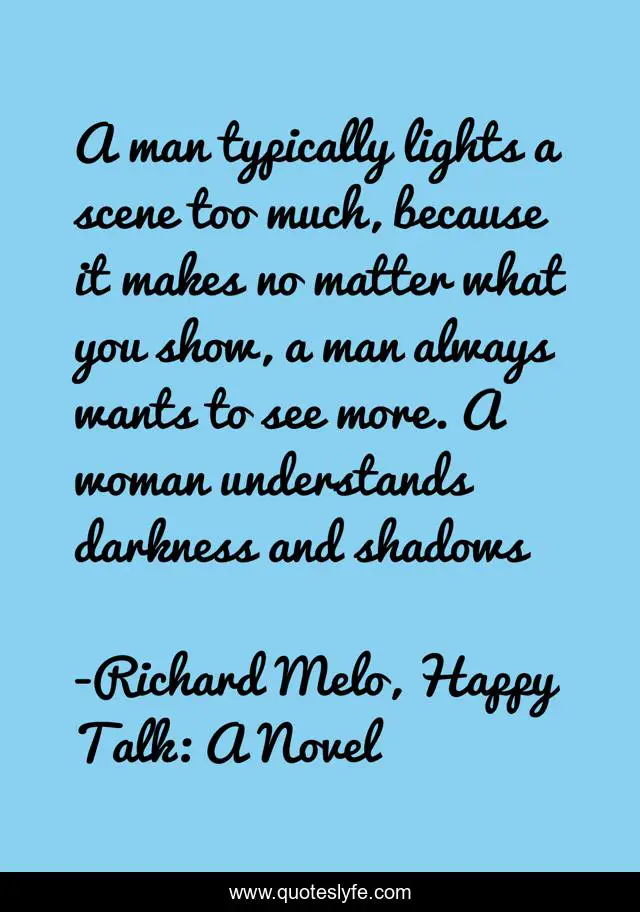 This page presents the quote "A man typically lights a scene too much, because it makes no matter what you show, a man always wants to see more. A woman understands darkness and shadows". Author of this quote is Richard Melo, Happy Talk: A Novel. This quote is about shadows, light, woman, man,.