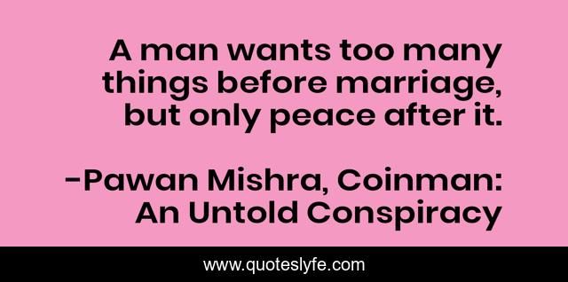 This page presents the quote "A man wants too many things before marriage, but only peace after it.". Author of this quote is Pawan Mishra, Coinman: An Untold Conspiracy. This quote is about funny, humor, relationship, longing, marriage-advice, peace, marriage-humor, marriage, husband,.