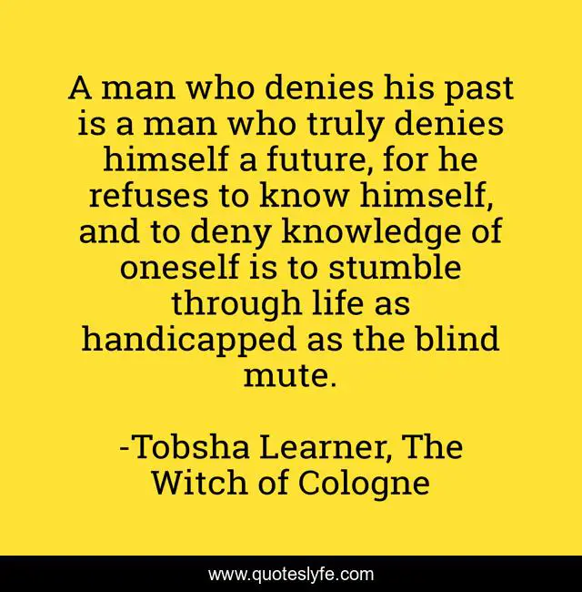 This page presents the quote "A man who denies his past is a man who truly denies himself a future, for he refuses to know himself, and to deny knowledge of oneself is to stumble through life as handicapped as the blind mute.". Author of this quote is Tobsha Learner, The Witch of Cologne. This quote is about denial, self-awareness, knowledge, inspiration,.