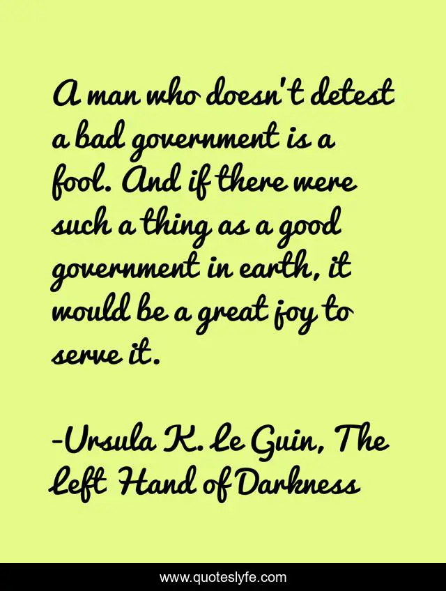 This page presents the quote "A man who doesn’t detest a bad government is a fool. And if there were such a thing as a good government in earth, it would be a great joy to serve it.". Author of this quote is Ursula K. Le Guin, The Left Hand of Darkness. This quote is about ursula-k-le-guin, ursula-le-guin, democracy, the-left-hand-of-darkness, government,.