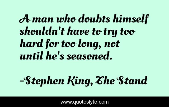 This page presents the quote "A man who doubts himself shouldn't have to try too hard for too long, not until he's seasoned.". Author of this quote is Stephen King, The Stand. .
