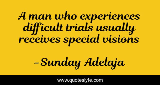 This page presents the quote "A man who experiences difficult trials usually receives special visions". Author of this quote is Sunday Adelaja. This quote is about life, calling, purpose, goals, fulfillment,.