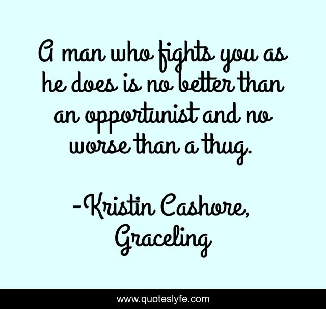This page presents the quote "A man who fights you as he does is no better than an opportunist and no worse than a thug.". Author of this quote is Kristin Cashore, Graceling. This quote is about opportunist, graceling, fighting,.