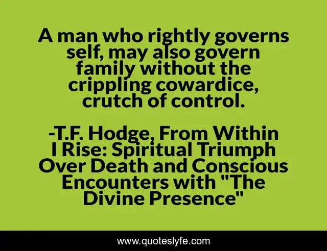 This page presents the quote "A man who rightly governs self, may also govern family without the crippling cowardice, crutch of control.". Author of this quote is T.F. Hodge, From Within I Rise: Spiritual Triumph Over Death and Conscious Encounters with "The Divine Presence". This quote is about control, self-awareness, family, self, manage, controlling, govern, manhood, man,.