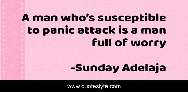 This page presents the quote "A man who’s susceptible to panic attack is a man full of worry". Author of this quote is Sunday Adelaja. This quote is about susceptible, attack, panic, worry, man,.