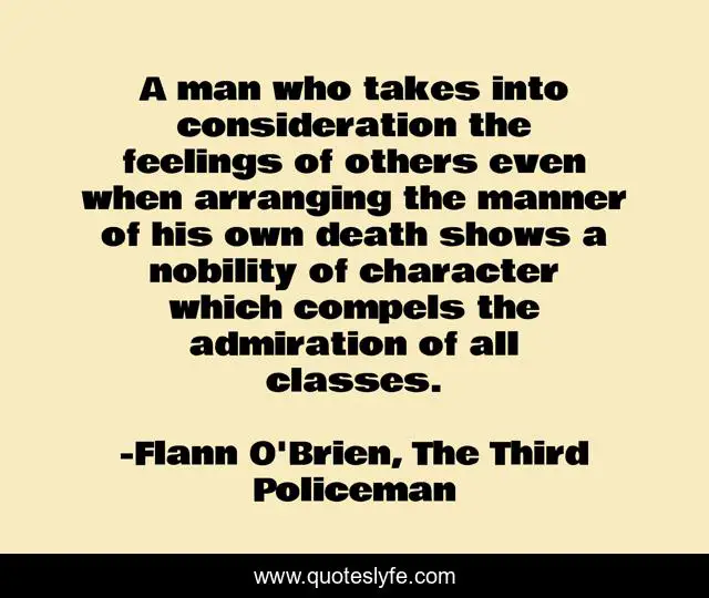This page presents the quote "A man who takes into consideration the feelings of others even when arranging the manner of his own death shows a nobility of character which compels the admiration of all classes.". Author of this quote is Flann O'Brien, The Third Policeman. .