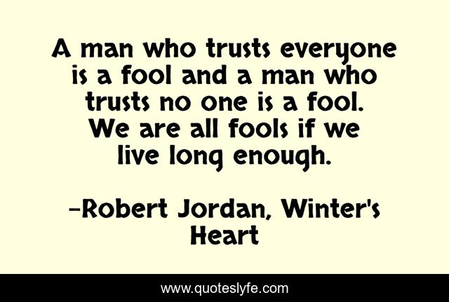 This page presents the quote "A man who trusts everyone is a fool and a man who trusts no one is a fool. We are all fools if we live long enough.". Author of this quote is Robert Jordan, Winter's Heart. This quote is about fools, humour,.