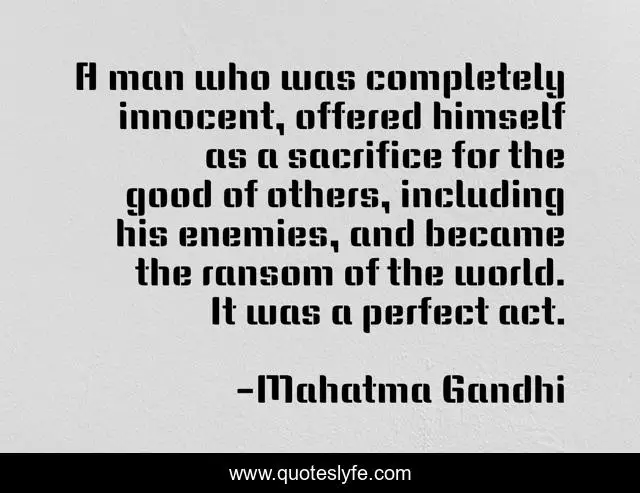 This page presents the quote "A man who was completely innocent, offered himself as a sacrifice for the good of others, including his enemies, and became the ransom of the world. It was a perfect act.". Author of this quote is Mahatma Gandhi. This quote is about world, sacrifice, man,.