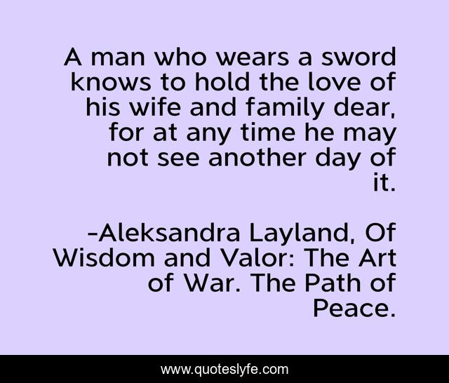 This page presents the quote "A man who wears a sword knows to hold the love of his wife and family dear, for at any time he may not see another day of it.". Author of this quote is Aleksandra Layland, Of Wisdom and Valor: The Art of War. The Path of Peace.. This quote is about warrior, love, wife, soldier, sword, family-love, affection,.