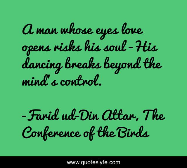 This page presents the quote "A man whose eyes love opens risks his soul -His dancing breaks beyond the mind's control.". Author of this quote is Farid ud-Din Attar, The Conference of the Birds. This quote is about love, inspirational, beauty, dance, truth, enthusiasm, affection,.