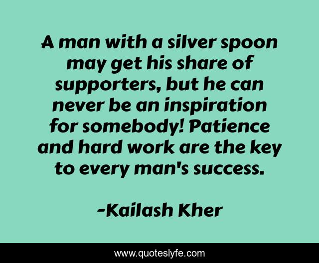 This page presents the quote "A man with a silver spoon may get his share of supporters, but he can never be an inspiration for somebody! Patience and hard work are the key to every man's success.". Author of this quote is Kailash Kher. This quote is about work, success, hard work,.