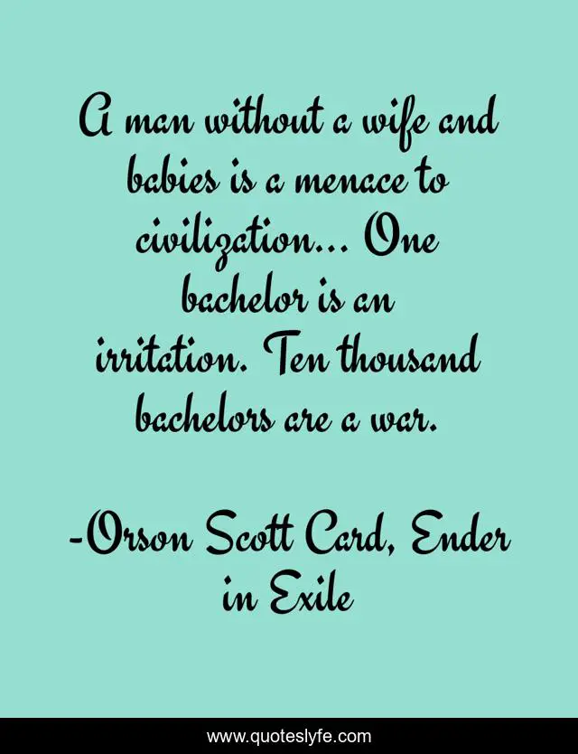 This page presents the quote "A man without a wife and babies is a menace to civilization... One bachelor is an irritation. Ten thousand bachelors are a war.". Author of this quote is Orson Scott Card, Ender in Exile. This quote is about society, men,.