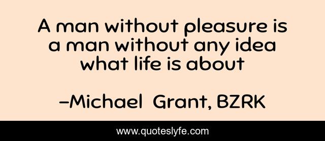This page presents the quote "A man without pleasure is a man without any idea what life is about". Author of this quote is Michael Grant, BZRK. This quote is about pleasure, life, truth,.