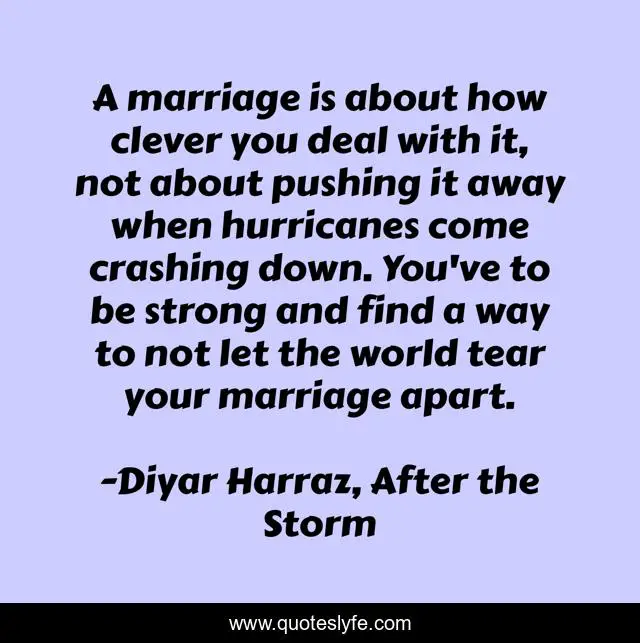 This page presents the quote "A marriage is about how clever you deal with it, not about pushing it away when hurricanes come crashing down. You've to be strong and find a way to not let the world tear your marriage apart.". Author of this quote is Diyar Harraz, After the Storm. This quote is about confidence, positive, motivational-for-women, motivational, optimistic, inspirational, enthusiasm, inspirational-love,.