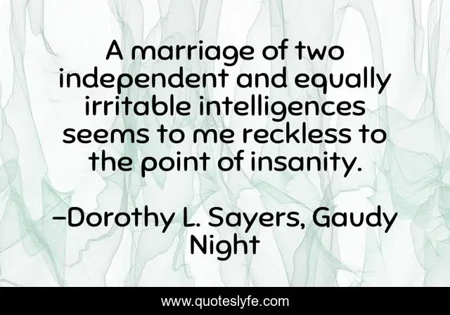 This page presents the quote "A marriage of two independent and equally irritable intelligences seems to me reckless to the point of insanity.". Author of this quote is Dorothy L. Sayers, Gaudy Night. This quote is about irritability, intelligence, matrimony, recklessness, marriage, independence,.