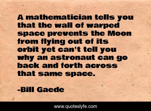 This page presents the quote "A mathematician tells you that the wall of warped space prevents the Moon from flying out of its orbit yet can't tell you why an astronaut can go back and forth across that same space.". Author of this quote is Bill Gaede. This quote is about mathematical-physics, general-relativity, relativity, warped-space, gaede, mathematicians, mathematics,.