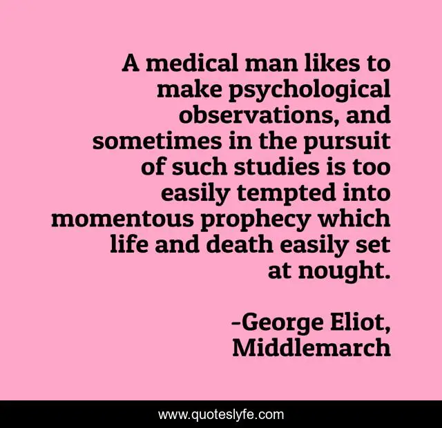 This page presents the quote "A medical man likes to make psychological observations, and sometimes in the pursuit of such studies is too easily tempted into momentous prophecy which life and death easily set at nought.". Author of this quote is George Eliot, Middlemarch. This quote is about physician, arrogance, psychology, humility,.