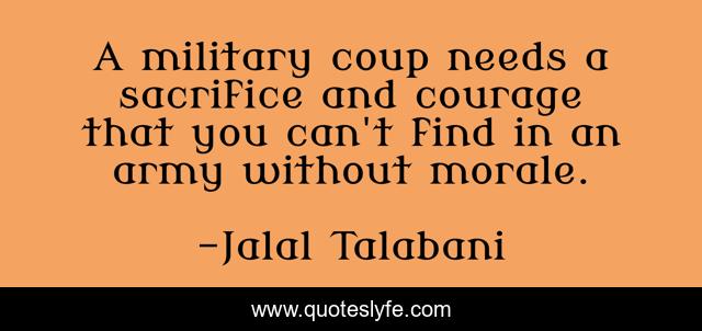 This page presents the quote "A military coup needs a sacrifice and courage that you can't find in an army without morale.". Author of this quote is Jalal Talabani. This quote is about military, sacrifice,.