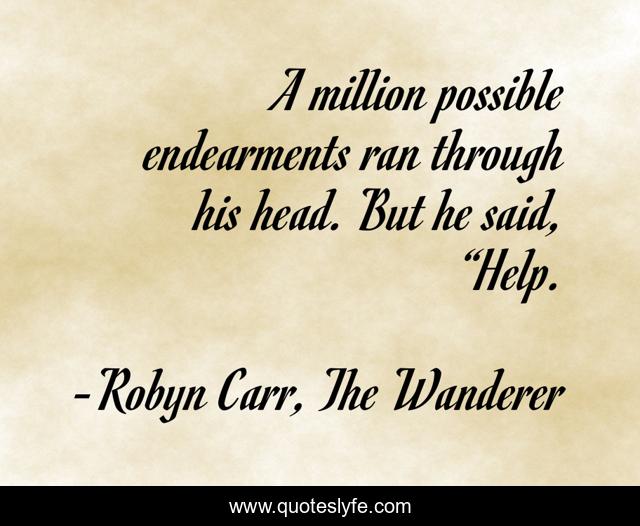 This page presents the quote "A million possible endearments ran through his head. But he said, “Help.". Author of this quote is Robyn Carr, The Wanderer. This quote is about romance, funny, comedy, contemporary-romance, humour,.