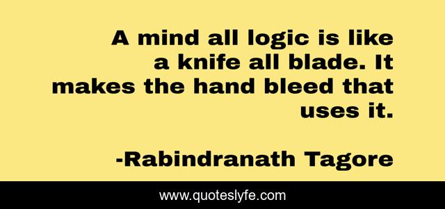 This page presents the quote "A mind all logic is like a knife all blade. It makes the hand bleed that uses it.". Author of this quote is Rabindranath Tagore. This quote is about emotion, logic,.