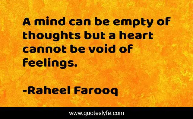 This page presents the quote "A mind can be empty of thoughts but a heart cannot be void of feelings.". Author of this quote is Raheel Farooq. This quote is about heart, love, mind, emotions, sentiments, thoughts, affection,.