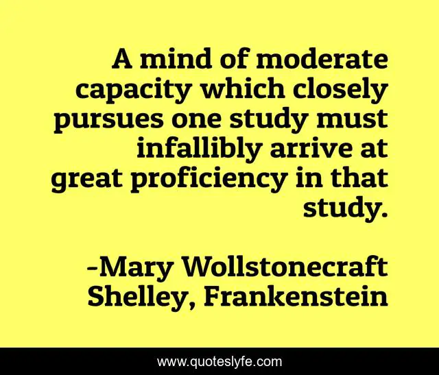This page presents the quote "A mind of moderate capacity which closely pursues one study must infallibly arrive at great proficiency in that study.". Author of this quote is Mary Wollstonecraft Shelley, Frankenstein. This quote is about positive, study, motivational, optimistic, confidence,.