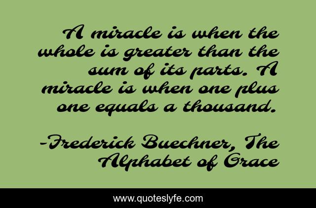 This page presents the quote "A miracle is when the whole is greater than the sum of its parts. A miracle is when one plus one equals a thousand.". Author of this quote is Frederick Buechner, The Alphabet of Grace. This quote is about miracles, spiritual, grace,.