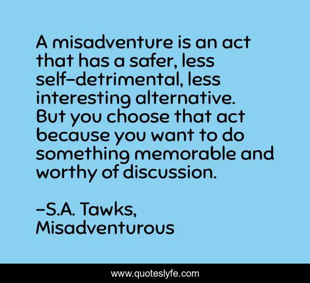 This page presents the quote "A misadventure is an act that has a safer, less self-detrimental, less interesting alternative. But you choose that act because you want to do something memorable and worthy of discussion.". Author of this quote is S.A. Tawks, Misadventurous. This quote is about queensland, memorable, australia, adventure, daring,.