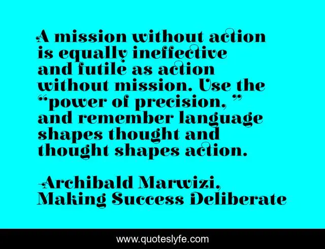 This page presents the quote "A mission without action is equally ineffective and futile as action without mission. Use the “power of precision, ” and remember language shapes thought and thought shapes action.". Author of this quote is Archibald Marwizi, Making Success Deliberate. This quote is about life, success, behaviour, attitude, legacy, growth, purpose, inspirational, leadership,.