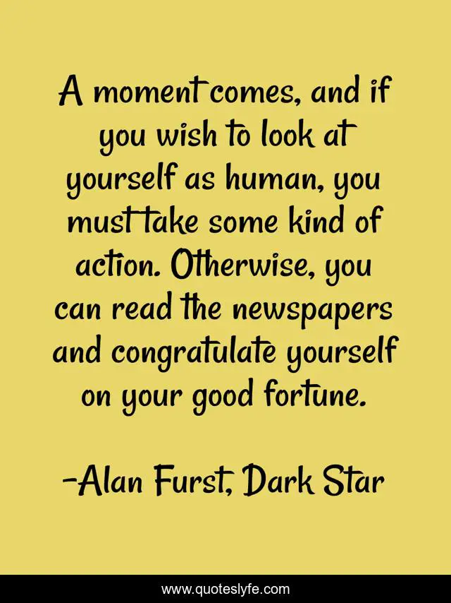 This page presents the quote "A moment comes, and if you wish to look at yourself as human, you must take some kind of action. Otherwise, you can read the newspapers and congratulate yourself on your good fortune.". Author of this quote is Alan Furst, Dark Star. This quote is about action, misfortune, humanity, good-fortune,.