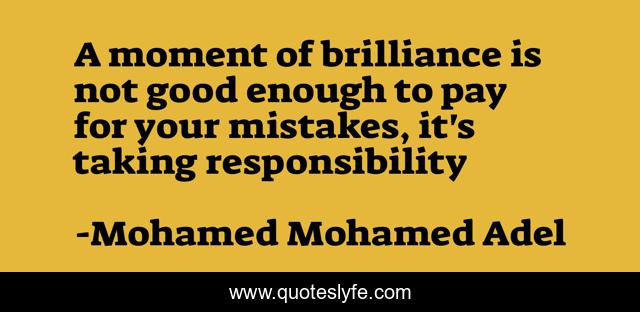 This page presents the quote "A moment of brilliance is not good enough to pay for your mistakes, it's taking responsibility". Author of this quote is Mohamed Mohamed Adel. This quote is about life, mistakes, responsibility, life-lessons,.