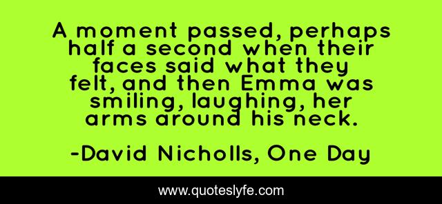 This page presents the quote "A moment passed, perhaps half a second when their faces said what they felt, and then Emma was smiling, laughing, her arms around his neck.". Author of this quote is David Nicholls, One Day. This quote is about friendship, love, affection,.