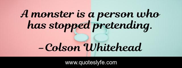 This page presents the quote "A monster is a person who has stopped pretending.". Author of this quote is Colson Whitehead. This quote is about pretense, monsters, people,.