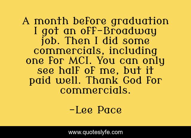 This page presents the quote "A month before graduation I got an off-Broadway job. Then I did some commercials, including one for MCI. You can only see half of me, but it paid well. Thank God for commercials.". Author of this quote is Lee Pace. This quote is about god, job, thank god,.