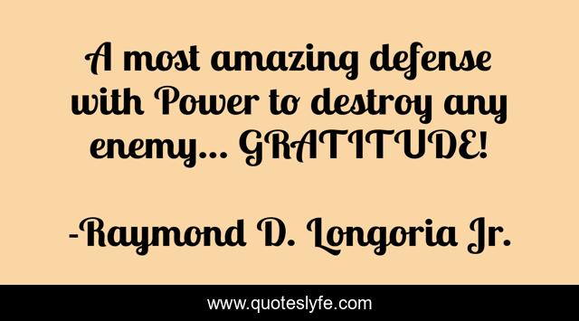 This page presents the quote "A most amazing defense with Power to destroy any enemy… GRATITUDE!". Author of this quote is Raymond D. Longoria Jr.. This quote is about life, freedom, peace, spiritual, soul, change, purpose, self-help, friendship,.