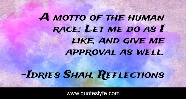 This page presents the quote "A motto of the human race: Let me do as I like, and give me approval as well.". Author of this quote is Idries Shah, Reflections. This quote is about approval, free-will,.