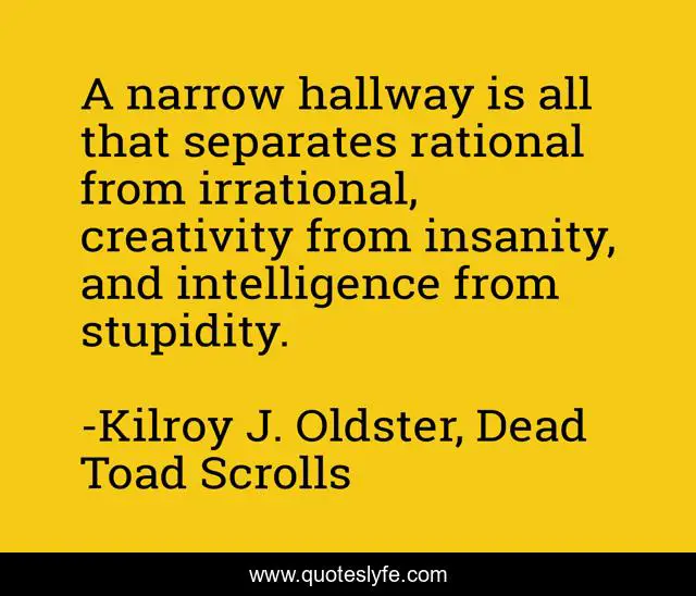 This page presents the quote "A narrow hallway is all that separates rational from irrational, creativity from insanity, and intelligence from stupidity.". Author of this quote is Kilroy J. Oldster, Dead Toad Scrolls. This quote is about insane, irrational, intelligence, creativity, insanity, imagination, stupidity, rationality, rational,.