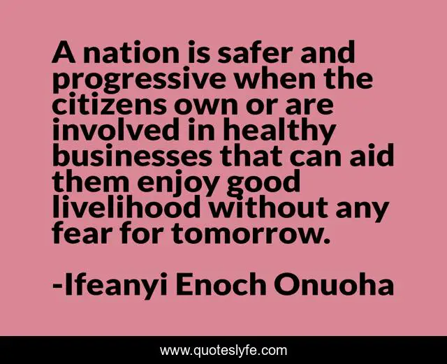 This page presents the quote "A nation is safer and progressive when the citizens own or are involved in healthy businesses that can aid them enjoy good livelihood without any fear for tomorrow.". Author of this quote is Ifeanyi Enoch Onuoha. This quote is about business, ifeanyi, onuoha, safety, enoch, nigeria, security,.