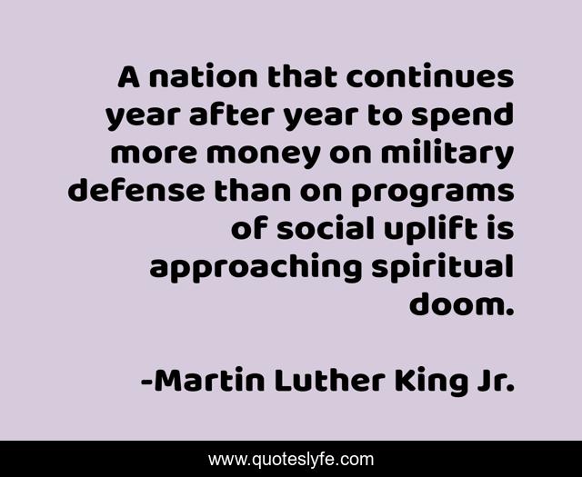 This page presents the quote "A nation that continues year after year to spend more money on military defense than on programs of social uplift is approaching spiritual doom.". Author of this quote is Martin Luther King Jr.. This quote is about military, war, social-change,.