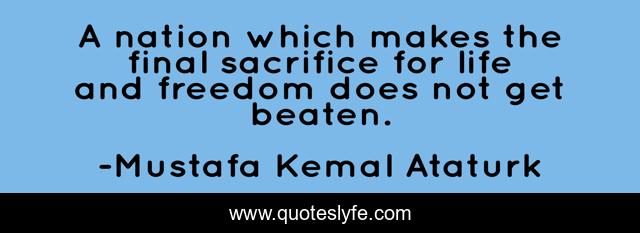 This page presents the quote "A nation which makes the final sacrifice for life and freedom does not get beaten.". Author of this quote is Mustafa Kemal Ataturk. This quote is about life, sacrifice, nation,.